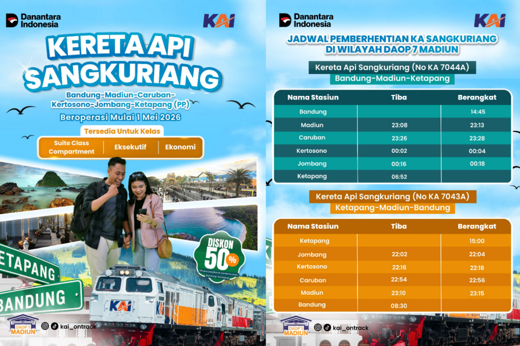 MADIUN – PT Kereta Api Indonesia/KAI (Persero) Daerah Operasi (Daop) 7 Madiun menyambut baik rencana peluncuran KA Sangkuriang rute Bandung – Ketapang (PP) yang akan mulai beroperasi pada tanggal 1 Mei 2026.